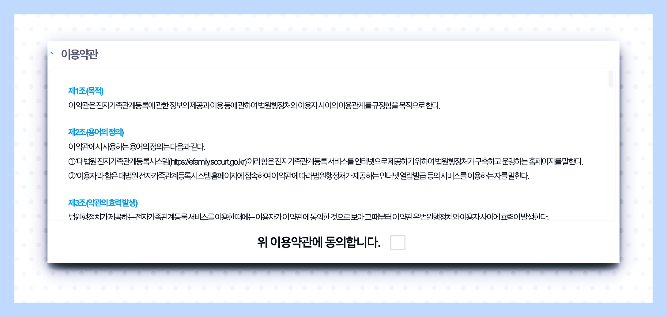 홈페이지에 접속하여 인증서 발급 메뉴에서 가족관계증명서를 선택할 수 있습니다. 발급 동의 양식을 주의 깊게 읽고 동의하면 발급 절차를 계속 진행할 수 있습니다.