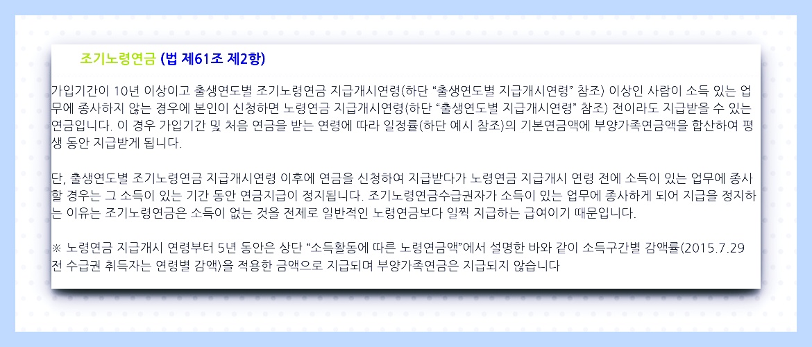 이러한 제도들의 경우 정해져있는 금액을 최소 10년 이상 납입한 후, 약 만 61세가 된다면 내가 이전에 지불했던 액수에 비례하는 만큼의 돈을 지급받게 되는 것입니다. 보통 이를 노령연금이라고 말하는 분들도 있습니다.