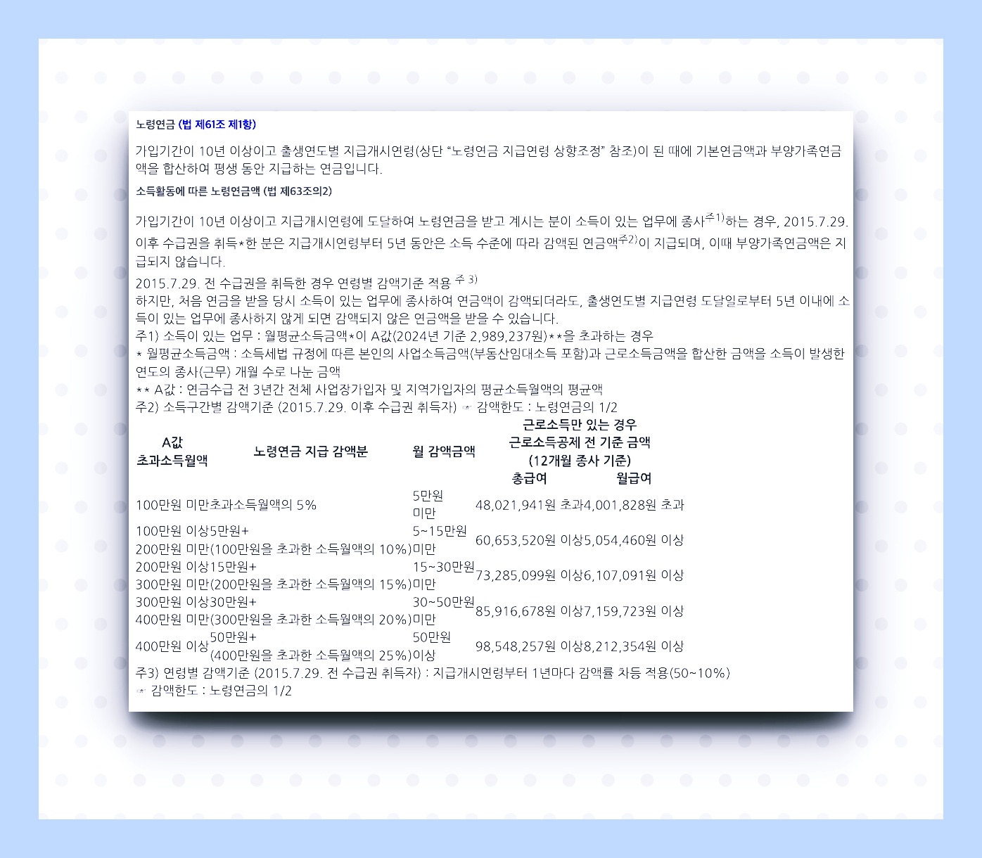 그렇지만, 어느 정도의 소득을 갖추고 계신 분들이라면 본래 받으실 수 있는 노령연금 금액에서 일정한 비율로 돈이 깎여버리게 되겠습니다.