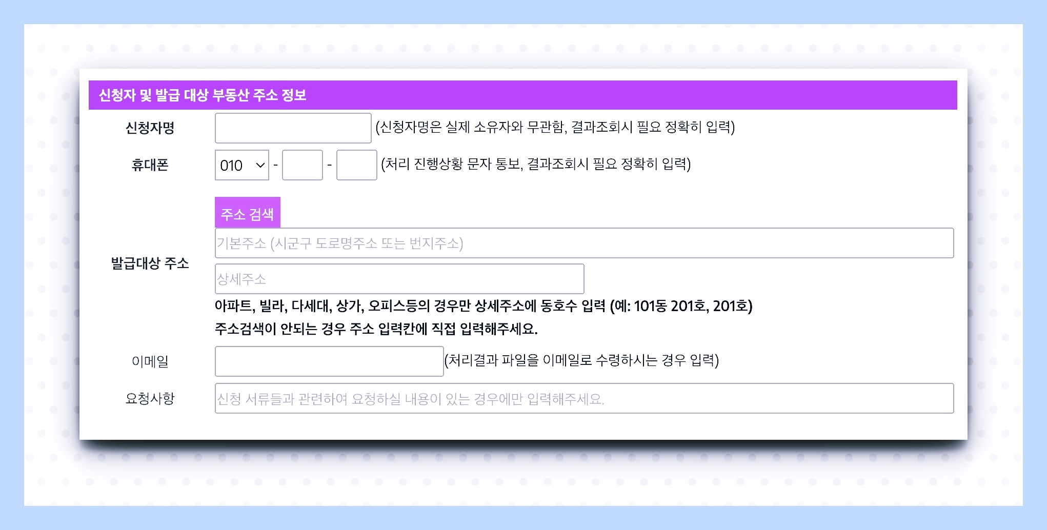 발급받고자 하는 지역의 주소를 정확하게 입력한 후 '선택' 버튼을 클릭하세요. 입력한 정보가 올바른지 다시 한 번 확인하는 것이 중요합니다.